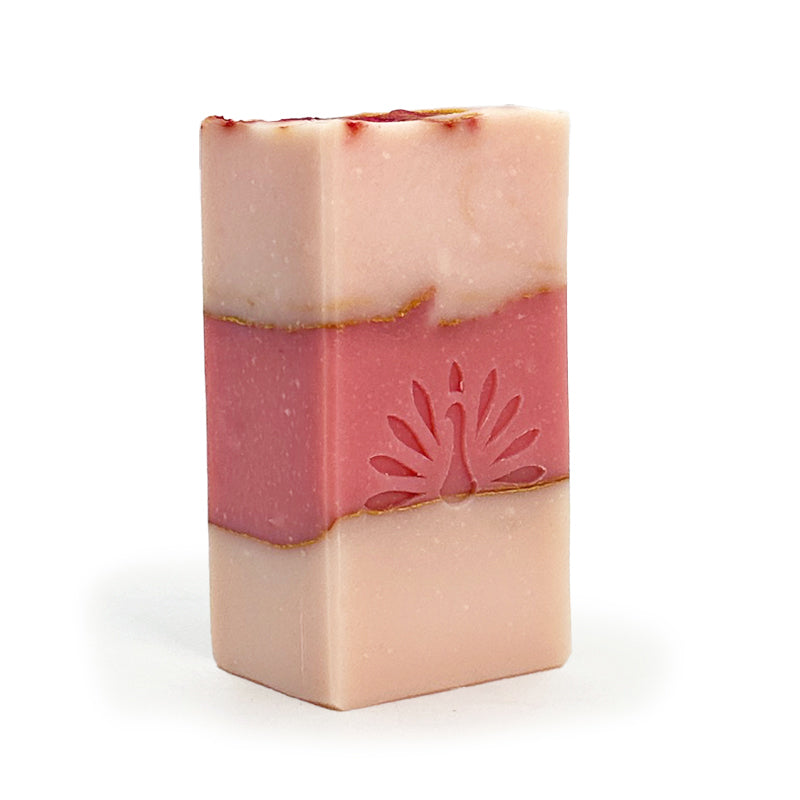 Gilded Rose blooms into a velvety lather and a romantic scent blend of rose and geranium that feels both calming and uplifting. A triple-layer soap in soft and vibrant pinks, accented with delicate gold pencil lines and finished with hand-swirled gold and blush on top.