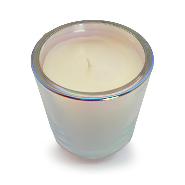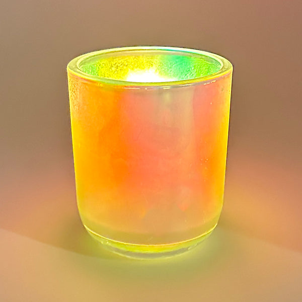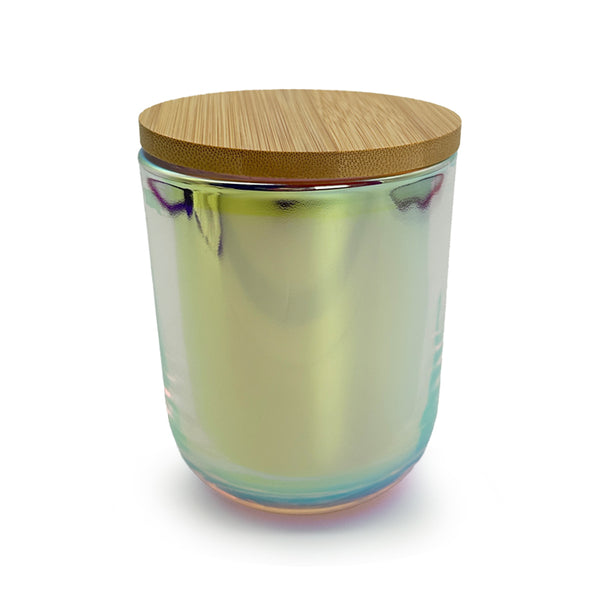 Elevate your space with this luminous beauty from our Summer Candle Series. Housed in a striking glass tumbler with an iridescent finish, this candle reveals a vivid spectrum of rainbow hues as it catches the light. Topped with a sleek bamboo lid, it exudes refined elegance.